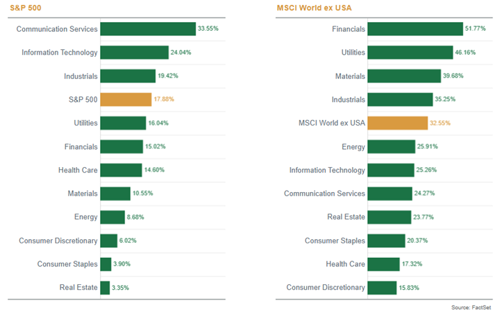 A significant rotation unfolded as international and emerging markets outperformed the U.S. by the largest differential since 2009. European equities advanced as financials, utilities, and industrials surged, although sector performance remained narrowly concentrated, with only three sectors outperforming in the MSCI World ex-USA Index
