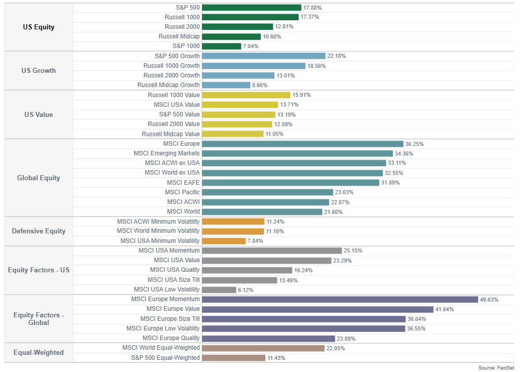 - U.S. large-caps delivered solid but comparatively modest returns (17.88% for the S&P 500 Index), powered largely by mega-cap technology and AI-related capital investment, amid ongoing concerns over concentration and potential bubble risks.