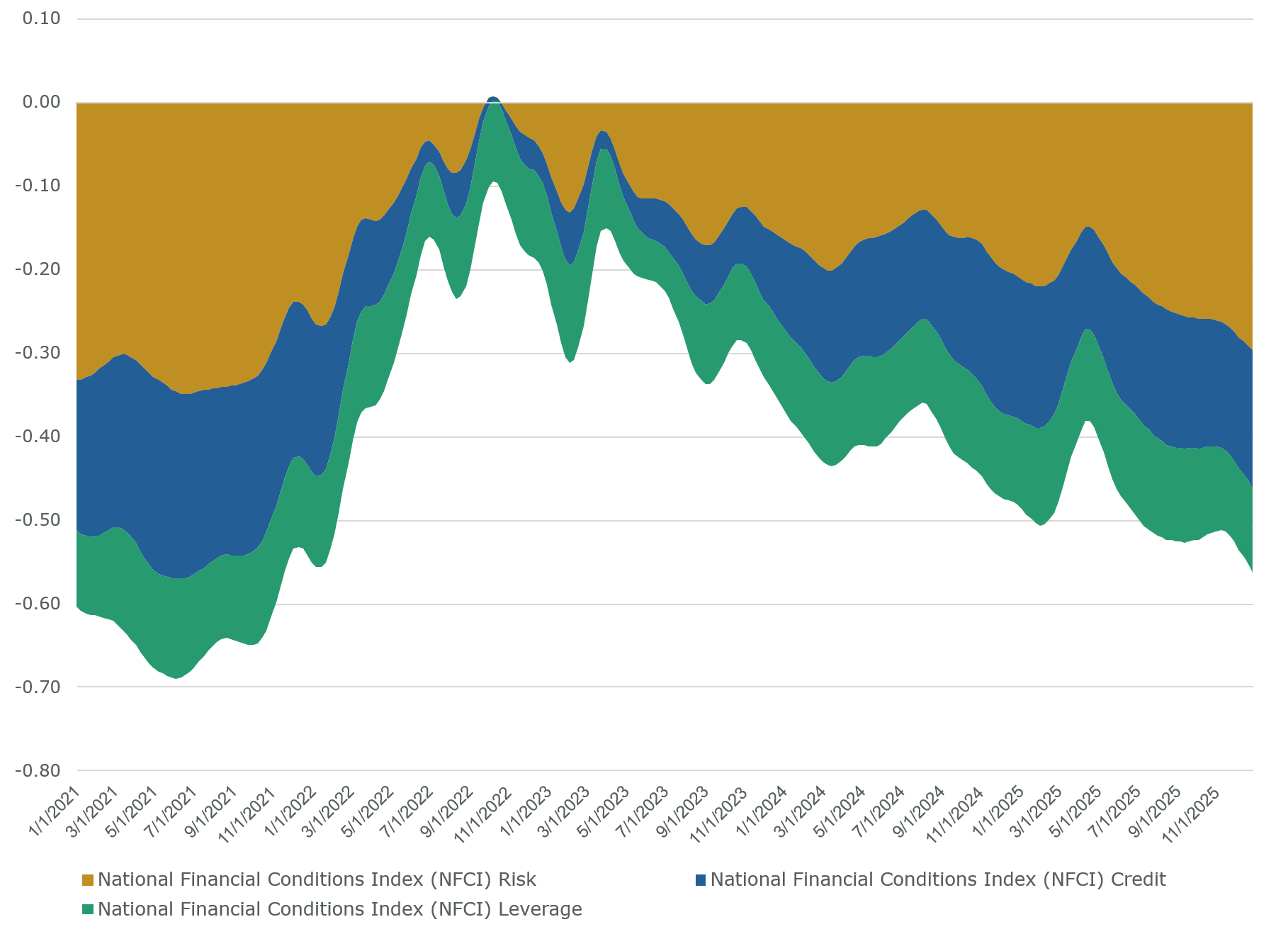 Source: Federal Reserve Bank of Chicago. National Financial Conditions Index (NFCI). The National Financial Conditions Index (NFCI) is a composite index published by the Federal Reserve Bank of Chicago that measures risk, credit, and leverage conditions in U.S. financial markets. This material reflects market conditions at a point in time and is subject to change. The index is for informational purposes only and does not represent the performance of any investment. You cannot invest directly in an index.