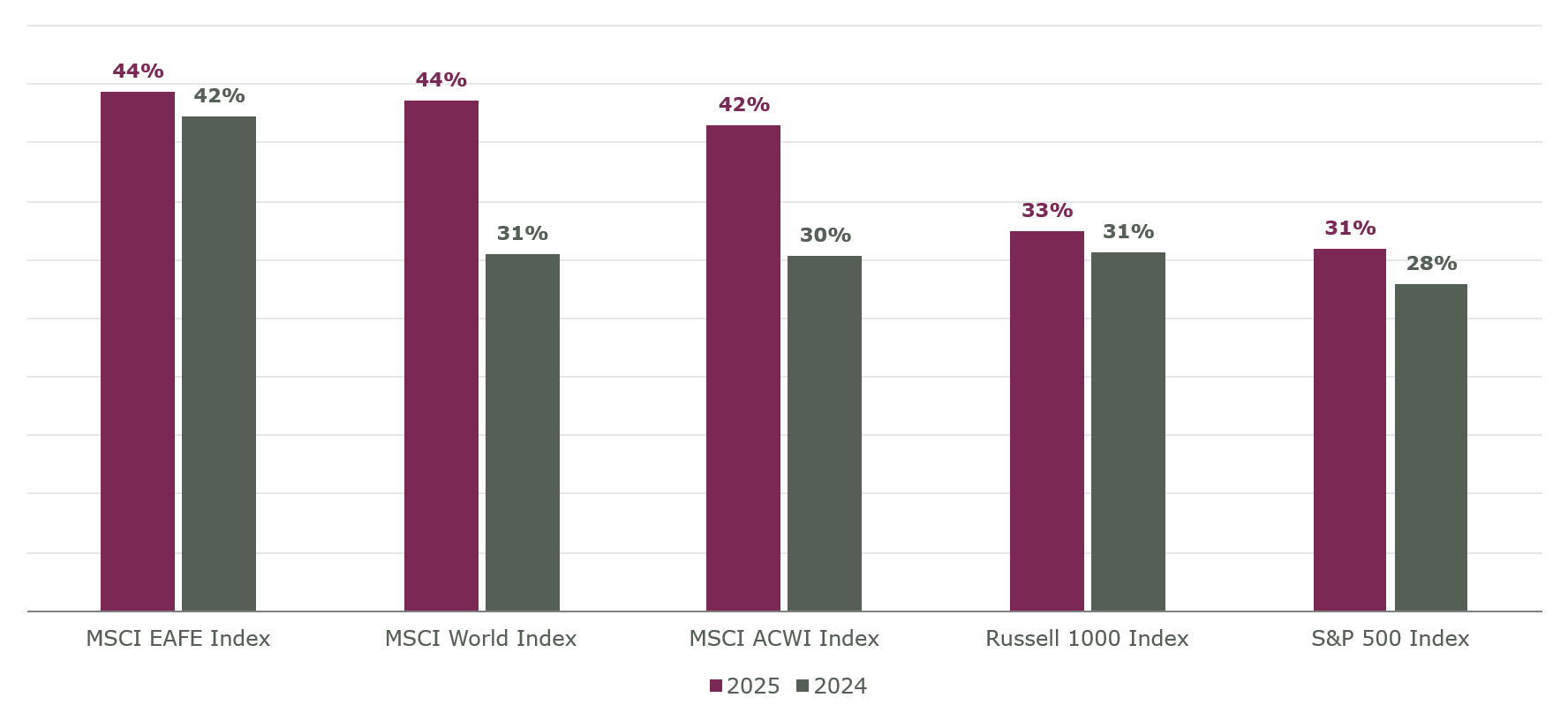 2025 Equity Market Breadth: Percentage of Stocks Outperforming in Indexes