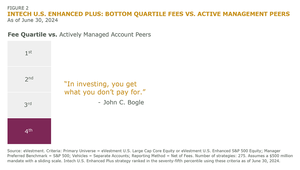 Bogle’s assertion, “In investing, you get what you don’t pay for,” resonates with us. Intech U.S. Enhanced Plus strategy’s published fees are in the bottom quartile compared to active management peers, contributing to the potential to outperform passive solutions (Figure 2).