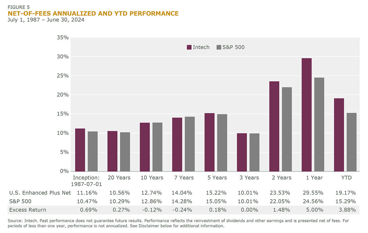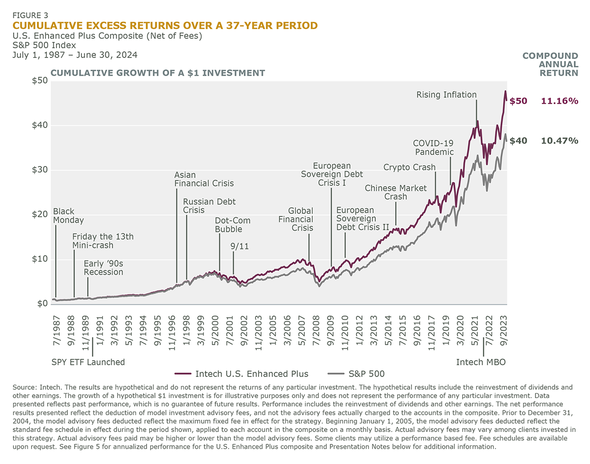 To illustrate this point, let’s look at the cumulative growth chart of hypothetical $1 invested in Intech U.S. Enhanced Plus from July 1, 1987 (inception) through June 30, 2024, versus the S&P 500 Index (Figure 3). This exhibit demonstrates how just 68 bps in annualized excess returns—net of fees—compound over time, leading to meaningful increases in the portfolio’s value over investing in the index alone. Of course, 36+ years of past performance cannot guarantee future results.