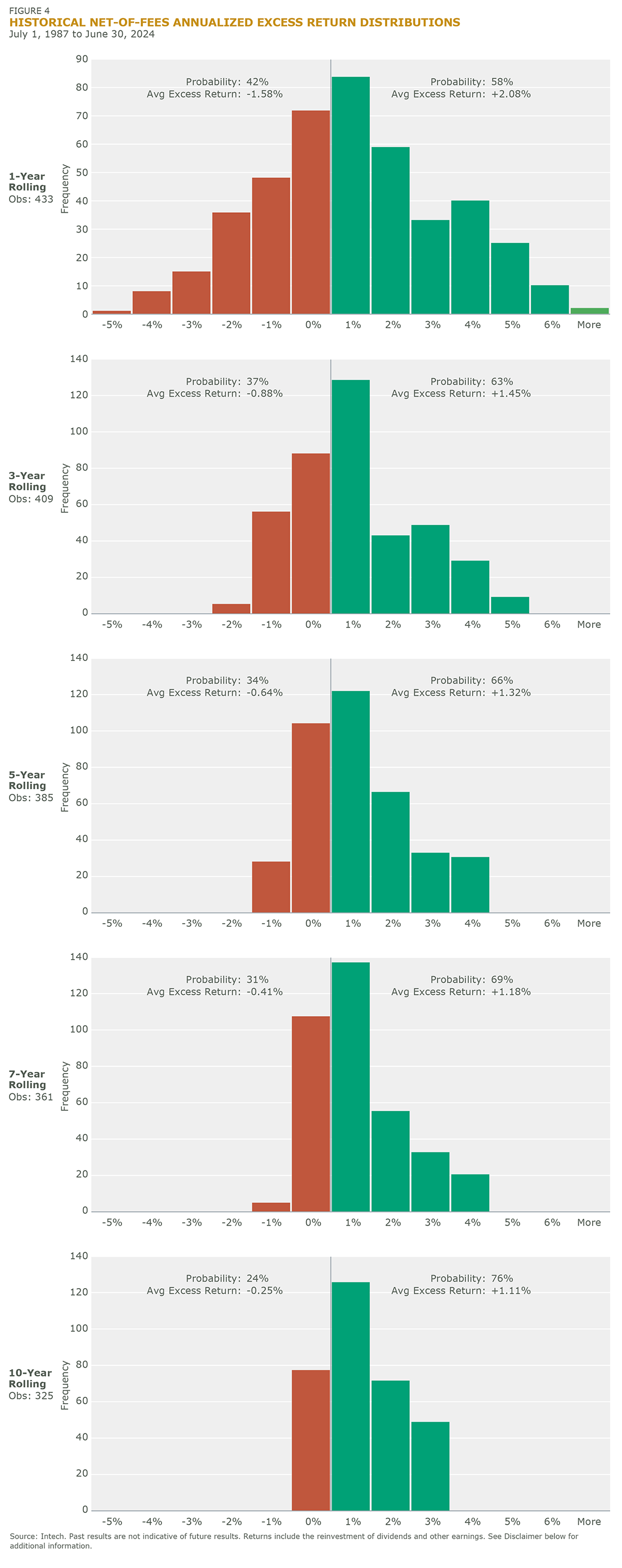 … investors historically experienced a 77% chance of achieving a 1.11% annualized excess return or a 23% chance of receiving roughly the benchmark return.