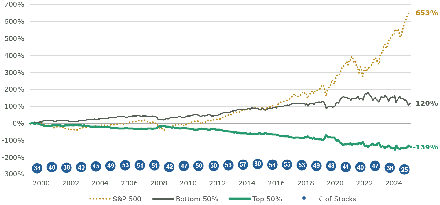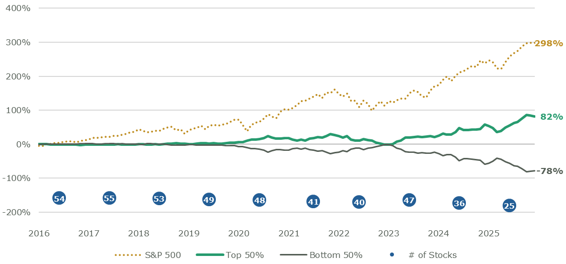 Figure 2 illustrates this by comparing S&P 500 Index performance to an equal-weighted split of the largest and smallest stocks by market capitalization (annual rebalance). Since 2016, the top 50% by market cap has outperformed the cap-weighted index, reflecting mega-cap dominance in the post-2010s bull market.