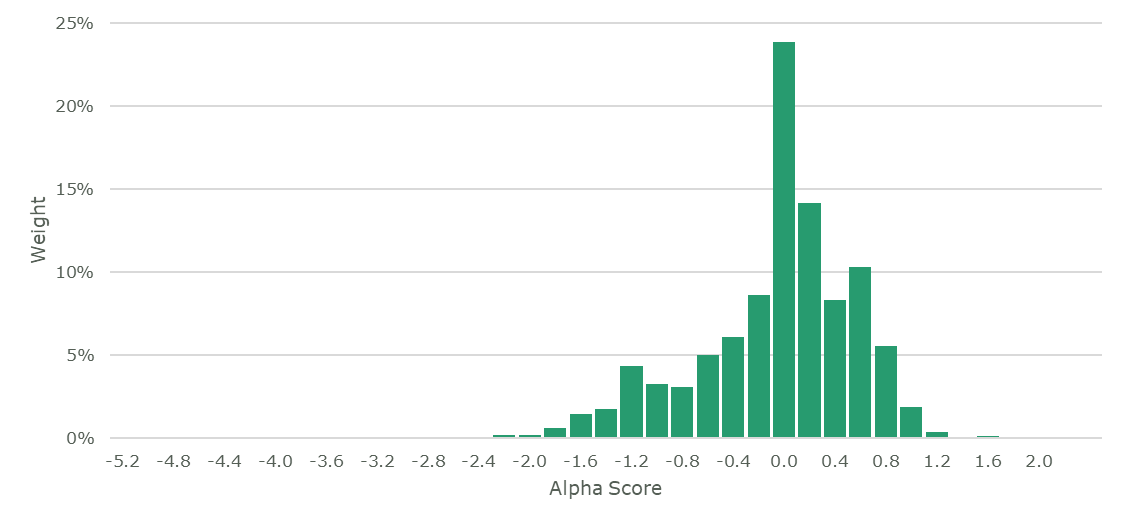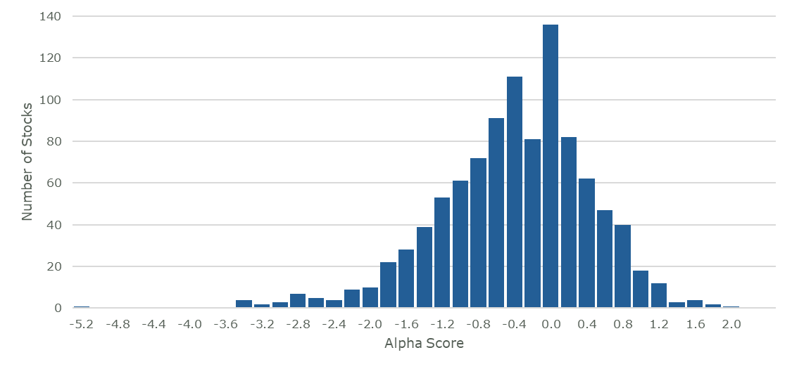 Distribution of alpha scores in the Russell 1000 Index