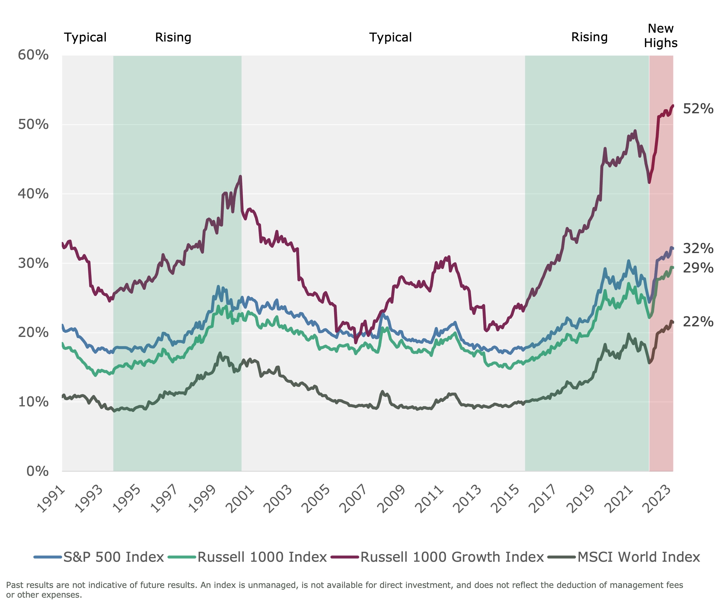FIGURE 3: TOP 10 STOCK CONCENTRATION BY INDEX REACHES NEW HIGHS  (1991-2023)