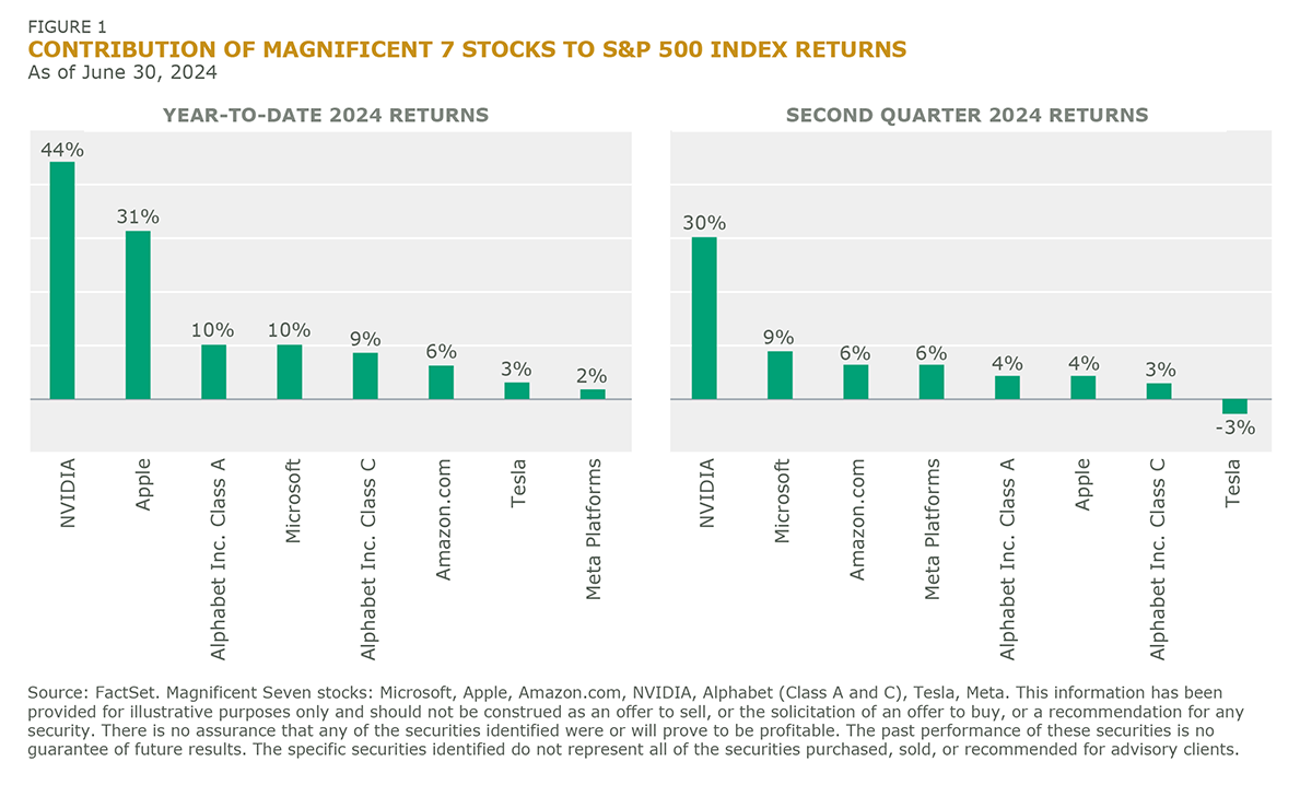 The second quarter saw a return to extreme levels of market concentration, reminiscent of trends observed in 2023. The AI sector, particularly stocks like Nvidia, played a pivotal role in driving market performance. Nvidia alone contributed 44% of the S&P 500 Index’s return for the quarter. Overall, the magnificent-7 companies have contributed 116% and 59% to the S&P 500 Index return during the second quarter and year-to-date, respectively, ending June 30, 2024. The dominance of AI-related stocks underscores the continued investor enthusiasm for technological innovation and its potential impact on future growth.