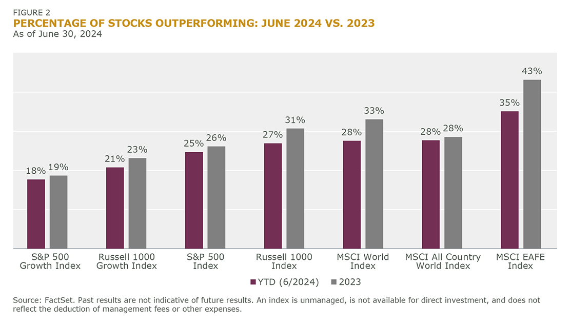 U.S. markets experienced above-average dispersion of returns, indicating a wide variation in stock performance. In contrast, non-U.S. markets exhibited less pronounced dispersion. Overall market breadth, measured by the percentage of outperforming stocks, dropped significantly from the previous quarter and even lower than the already subdued levels seen last year, both in U.S. and non-U.S. markets.
