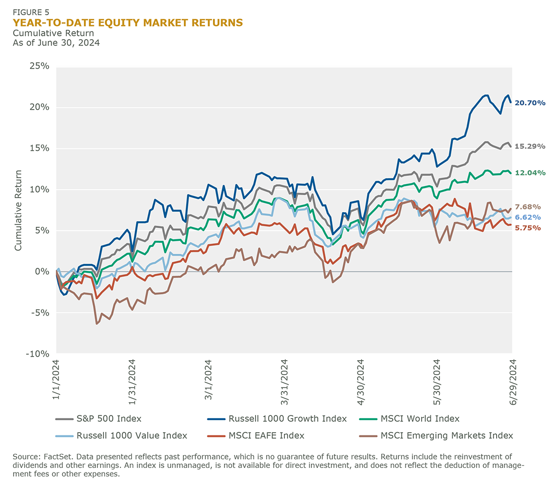 The second quarter of 2024 demonstrated the resilience and adaptability of global equity markets amidst a backdrop of economic uncertainty and sector divergence. The anticipated rate cuts by the Federal Reserve have fueled optimism, particularly benefiting larger and growth-oriented stocks, with a notable concentration in AI-related equities like Nvidia. Despite the overall positive market sentiment, the narrow breadth and extreme market concentration present challenges that warrant careful navigation.