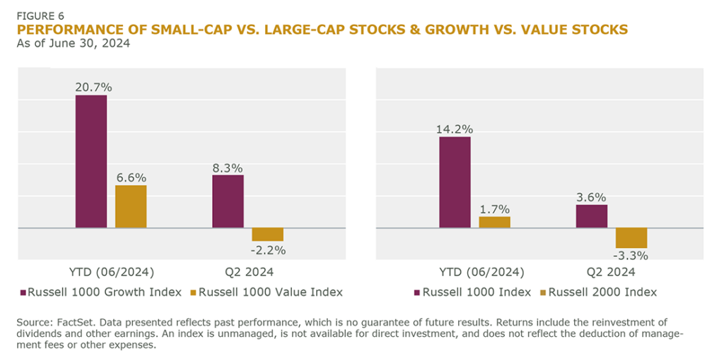 A notable shift occurred in market breadth during the second quarter. Following a brief period in Q1 2024 where smaller-cap and value stocks saw increased participation in the market rally, Q2 2024 marked a reversion to a more concentrated market environment. Mega-cap U.S. stocks, particularly those within the AI sector, vastly outperformed their smaller counterparts. This was evident as growth stocks significantly outpaced value stocks, and cap-weighted indexes outperformed equal-weighted ones.